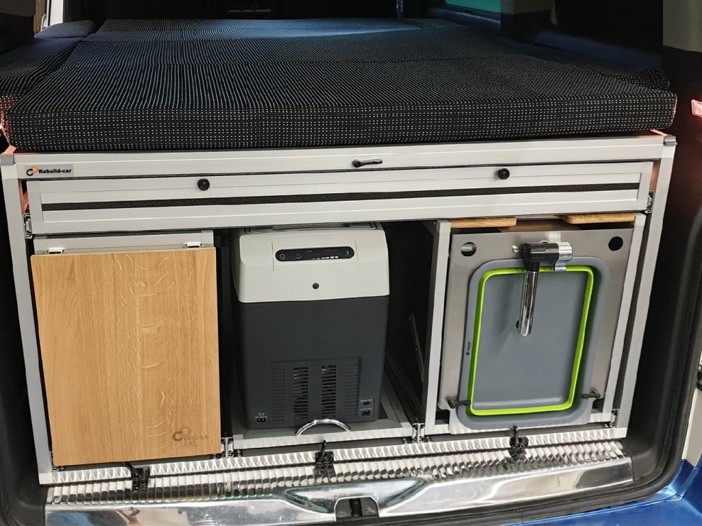 - Skrzynka na wodę wyposażona jest w 2 kanistry o pojemności 2 x 15 litrów oraz pompę 12V. Główna część zlewozmywaka na zawiasach wykonana jest z części ze stali nierdzewnej, którą montujemy za pomocą składanego zlewozmywaka firmy Outwell. Górna część pudełka pokryta jest drewnianą, ekologiczną deską nadającą się do przygotowywania potraw.