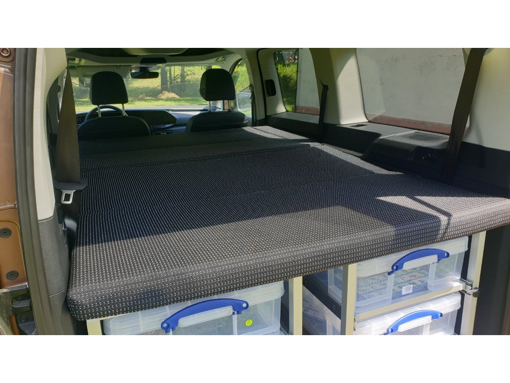 - Łóżko o długości 200 cm z materacem piankowym (wysokość materaca 7 cm). Materac jest szyty na miarę i rozciąga się na całej szerokości samochodu . Łóżko jest niezależne od siedzeń (wideo). Po rozłożeniu łóżka będziesz miał pod łóżkiem schowek o wysokości ok. 58 cm.