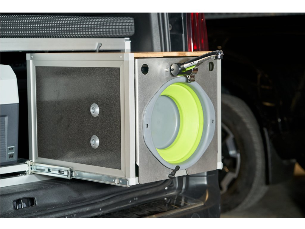 - Skrzynka na wodę wyposażona jest w 2 kanistry o pojemności 2 x 15 litrów oraz pompę 12V. Główna część zlewozmywaka na zawiasach wykonana jest z części ze stali nierdzewnej, którą montujemy za pomocą składanego zlewozmywaka firmy Outwell. Górna część pudełka pokryta jest drewnianą, ekologiczną deską nadającą się do przygotowywania potraw. .